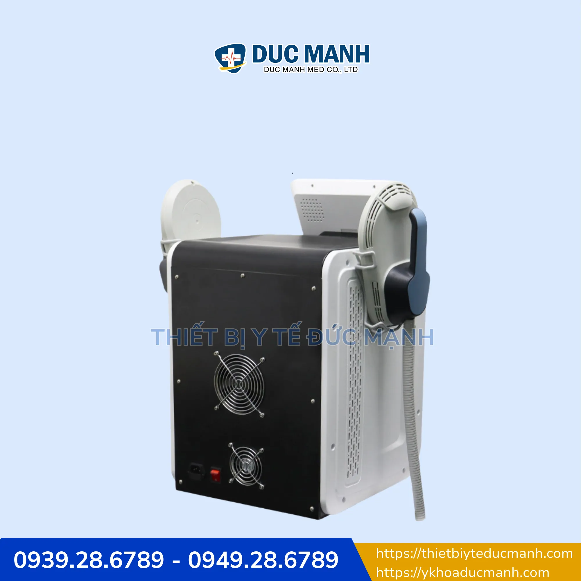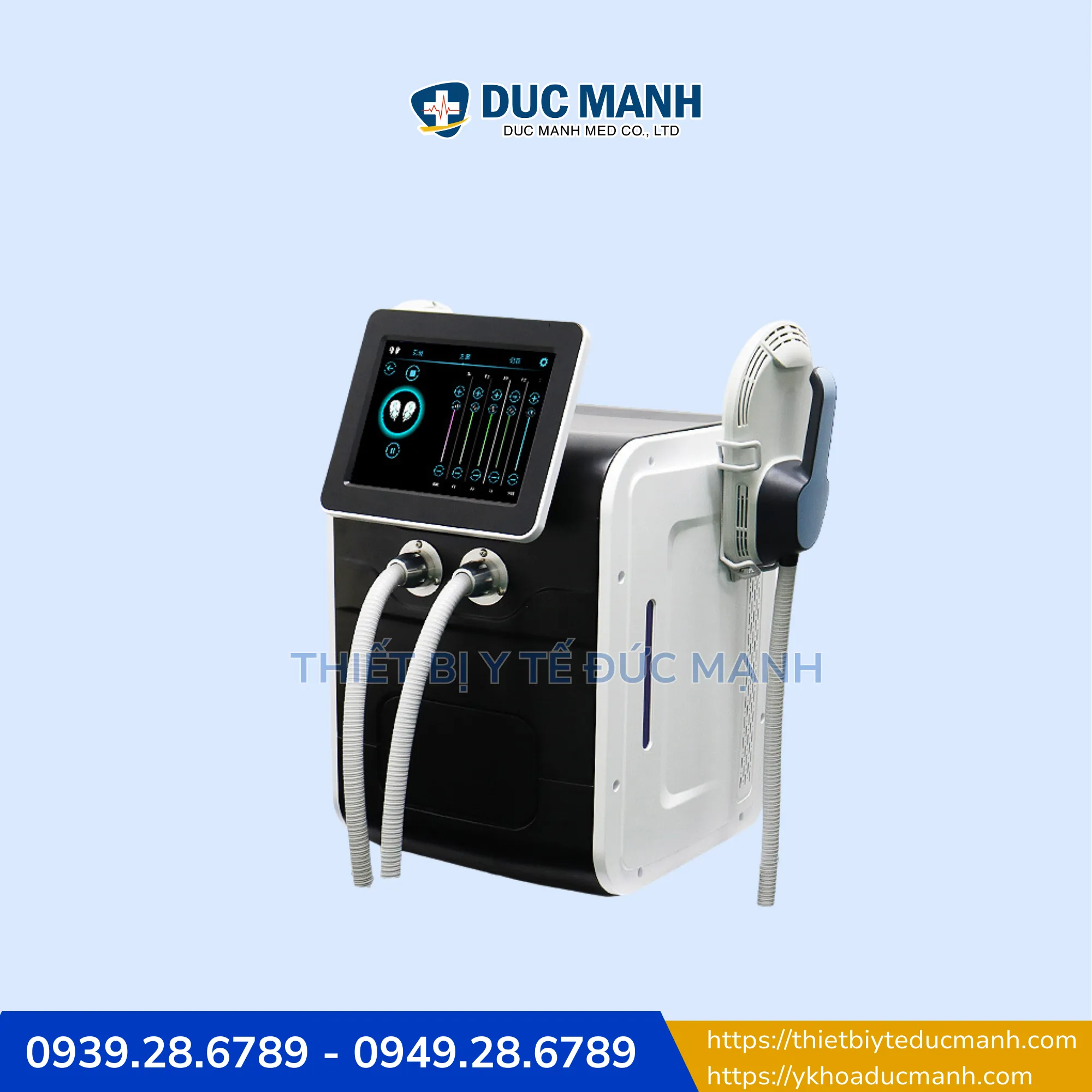 Máy tăng cơ giảm mỡ công nghệ HIFEM đi kèm với hai tay cầm điều trị lớn, có khả năng hoạt động đồng bộ hoặc độc lập, cho phép điều trị cùng lúc hai người hoặc hai vùng khác nhau trên một cơ thể.